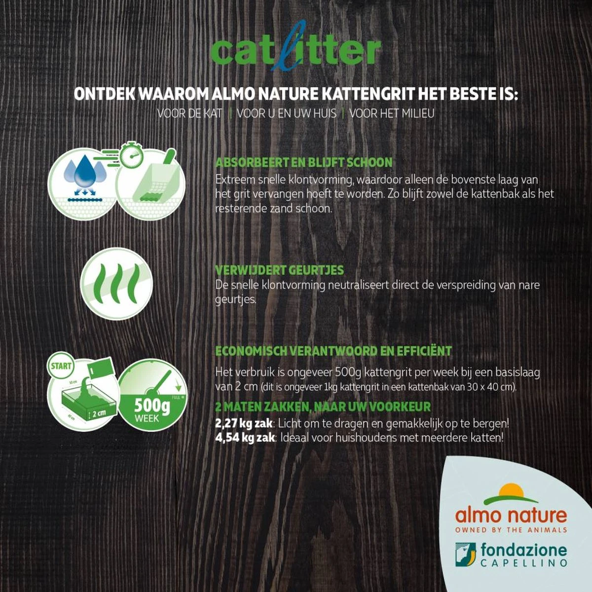 Extreem snelle klontvorming waardoor alleen de bovenste laag van het Almo Nature kattengrit vervangen hoeft te worden. Hierdoor blijft zowel de kattenbak als de resterende kattenbakvulling schoon.