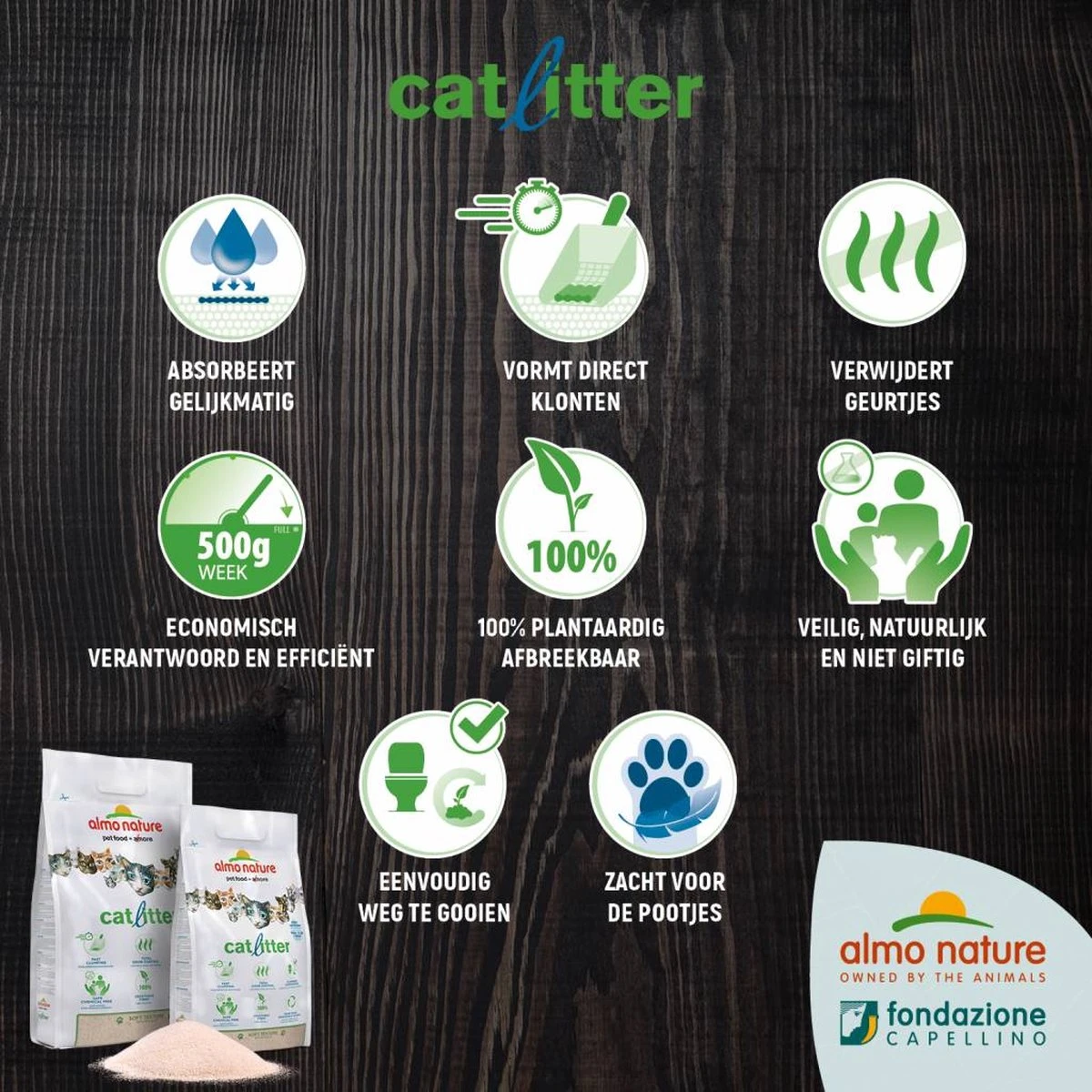 Herstel wekelijks de basis laag door bij te vullen met 1/4 zak / 500g Almo Nature kattengrit.