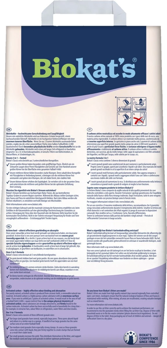 - LEVERINGSOMVANG: 1 papieren zak 14 liter Biokat’s Classic 3in1 Extra, grove kattenbakvulling met actieve kool – Parfumvrij – Made in Germany