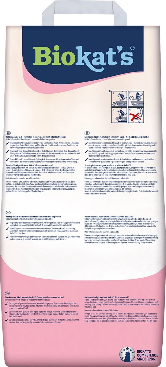 - LEVERINGSOMVANG: 1 papieren zak 10 liter Biokats Classic fresh 3in1, grove kattenbakvulling met Babypoeder-Geur -Made in Germany