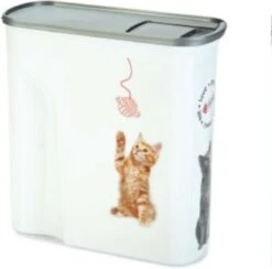 De Curver Voedselcontainer Kat is een zeer handige container voor het bewaren van kattenbrokjes. Met deze container heb je nooit meer een zak brokjes in de schuur of kelder, maar is het netjes opgeborgen in een fraai uitziende container. De container bevat een handige opening aan de bovenkant, zodat je de brokjes gemakkelijk in een kattenvoerbak kunt schenken. Leuk detail: voorzien van diverse kattenprints.