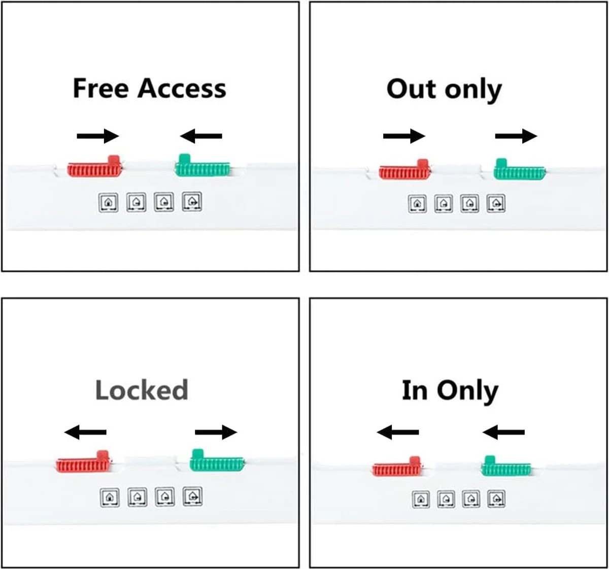 Het kattenluik kan door de rode en groene schakelaars met lipjes worden ingesteld op 4 standen: uit, in, zowel in als uit, en volledig vergrendeld. De lipjes zijn de belangrijkste factor voor de 4-standen schakelaar.