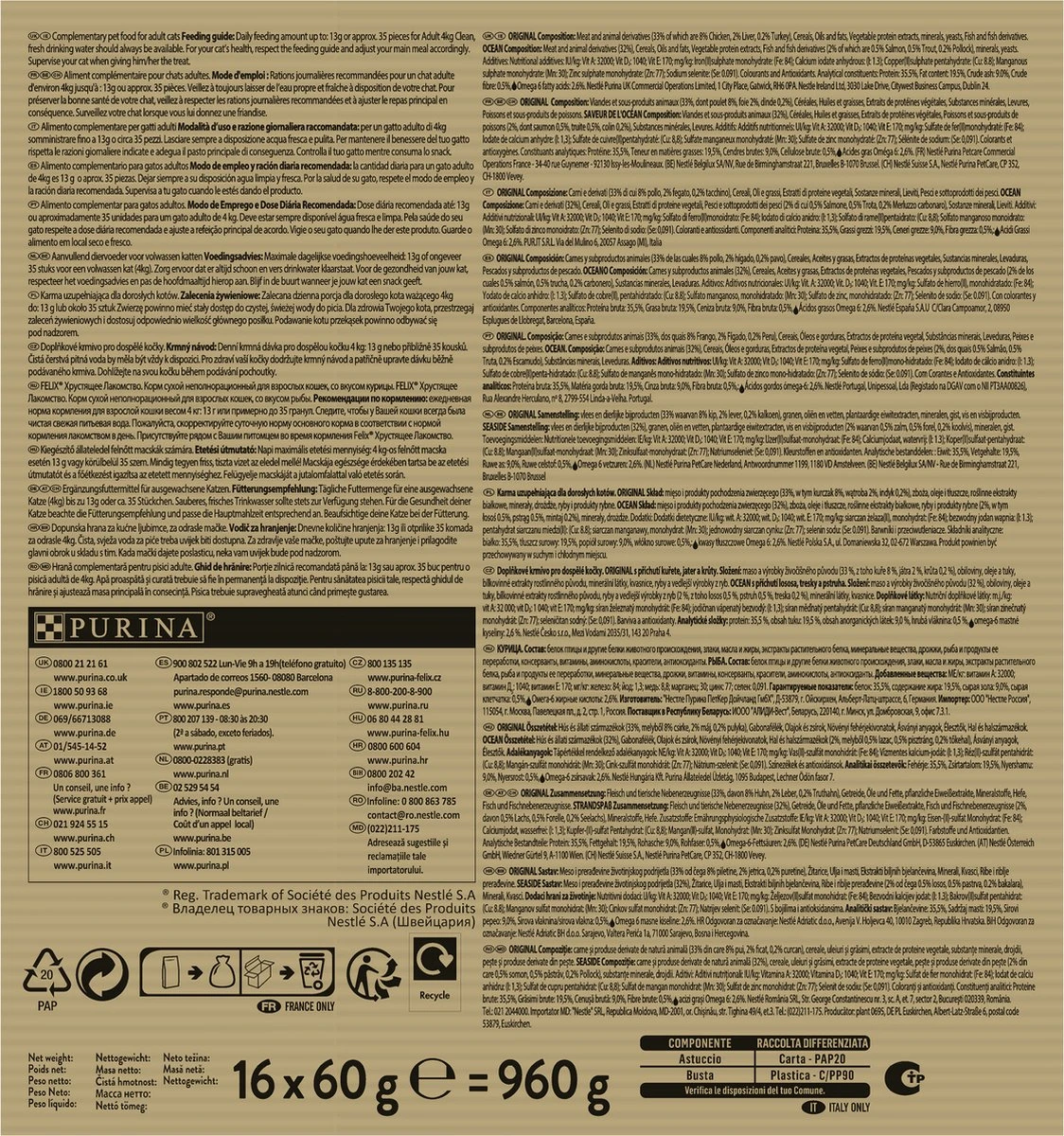 | Verpakkingsinhoud | Original Samenstelling : Vlees en dierlijke bijproducten (34% waarvan 8% Kip, 2% Lever, 0,2% Kalkoen), Granen, Oliën en vetten, Plantaardige eiwitextracten, Mineralen, Suiker, Gist, Vis en visbijproducten,. Seaside Mix Samenstelling : Vlees en dierlijke bijproducten (32%), Granen, Oliën en vetten, Plantaardige eiwitextracten, Vis en visbijproducten (2% waarvan 0,5% Zalm, 0,5% Koolvis, 0,2% Forel), Mineralen, Suiker, Gist. |
