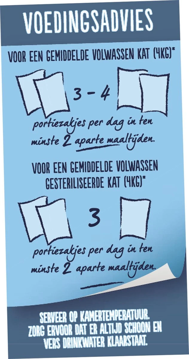 | Voedingsadvies | Voedingsadvies: Voor een gemiddelde volwassen kat (4kg)*, geef 3-4 portiezakjes per dag in ten minste 2 aparte maaltijden. Voor een gemiddelde volwassen gesteriliseerde kat (4kg)* geef 3 portiezakjes per dag in ten minste 2 aparte maaltijden. Serveer op kamertemperatuur. Zorg ervoor dat er altijd schoon en vers drinkwater klaarstaat. *De gemiddelde hoeveelheden voor volwassen katten zijn gebaseerd op gemiddeld actieve katten bij normale omgevingstemperaturen. Individuele behoeften variëren en de voeding moet indien nodig worden aangepast om jouw kat op een slank, gezond lichaamsgewicht te houden. |