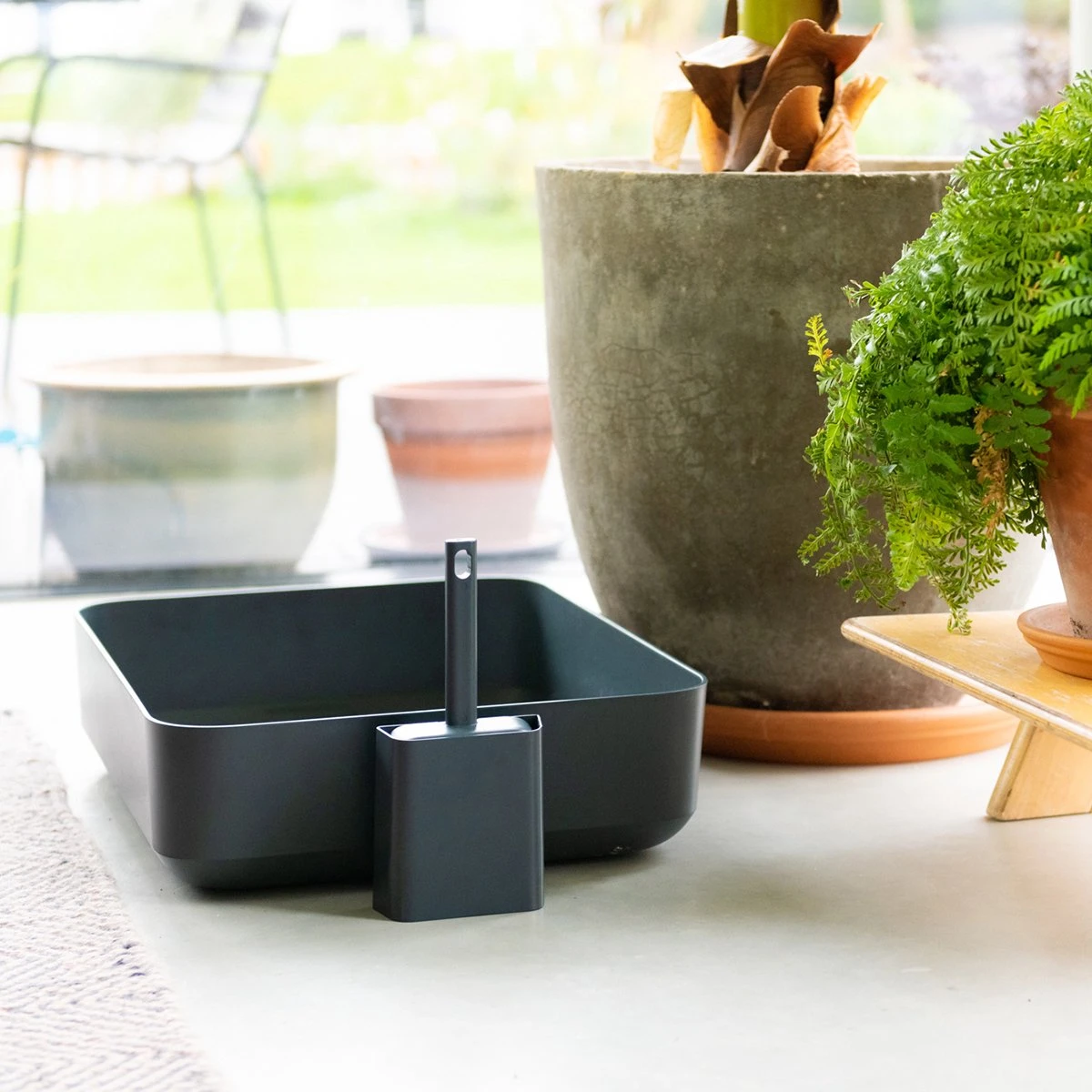Het Poh kattentoilet is gemaakt van hoogwaardig sterk kunststof dat gemakkelijk schoon te maken is en stevig aanvoelt. Schoonmaken gaat makkelijk met het handige meegeleverde schepje dat mooi past in het daarbij behorende containertje. Dankzij het stijlvolle ontwerp hoeft de kattenbak niet verstopt te worden en kan hij overal geplaatst worden.
