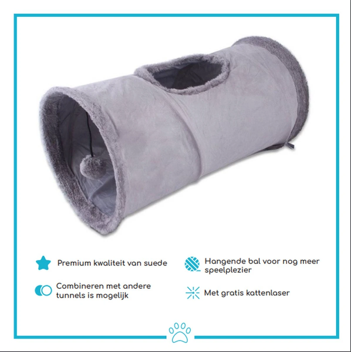 Deze nieuwe speeltunnel zal uw kat geweldig vinden. De tunnel is getest op het gebruik van katten en is stevig genoeg. Ook vinden wij het exterieur van de tunnel zeer belangrijk, daarom hebben wij de keuze gemaakt om een suede afronding te doen. Dan heeft niet alleen uw huisdier maar ook u plezier ervan.
