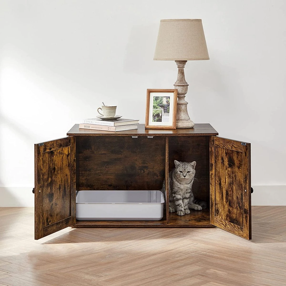 - Twee deuren met handgrepen bieden gemakkelijke toegang tot de kattenkast om het strooisel weg te gooien