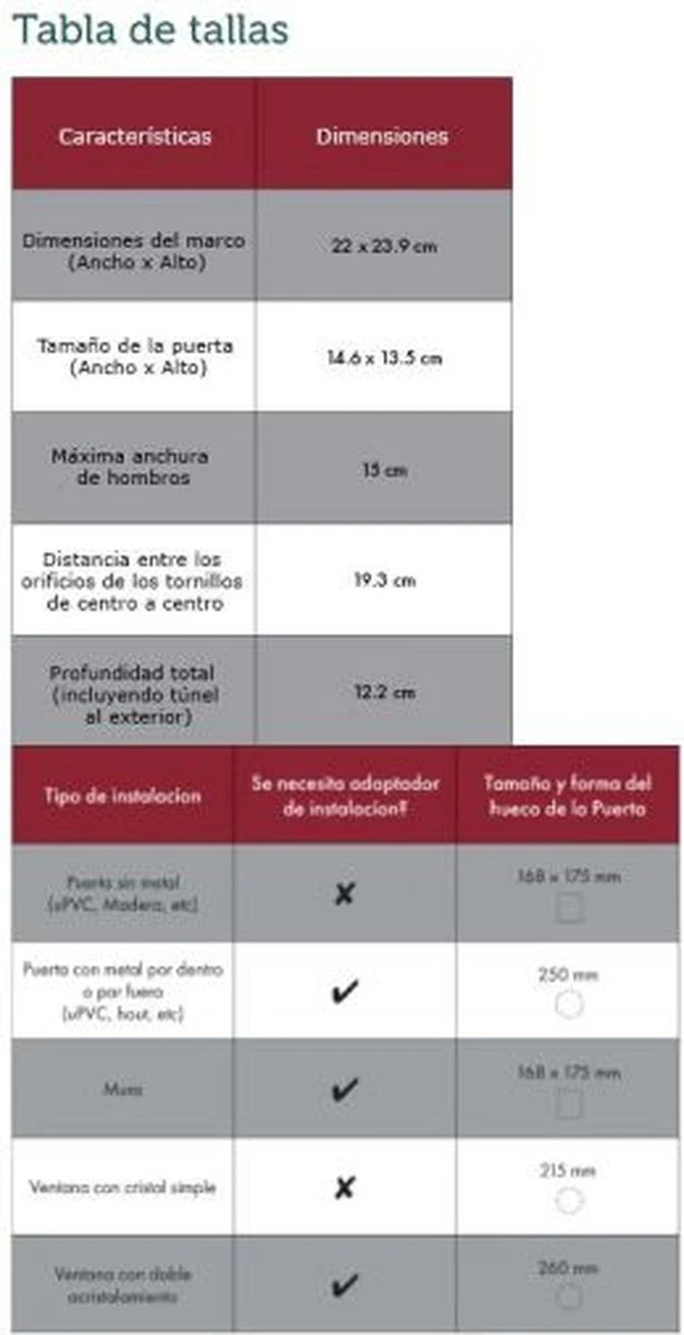 Het Dierenluik is gemaakt van stevig en duurzaam plastic en heeft een diepte van 12,2 cm (5 cm mechanisme en 7,2 cm voor de tunnel). Het luik is te gebruiken voor katten en kleine hondenrassen tot 8 kg lichaamsgewicht. De sterke transparante klep biedt doorgang voor dieren met een schouderbreedte van maximaal 15,0 cm.
