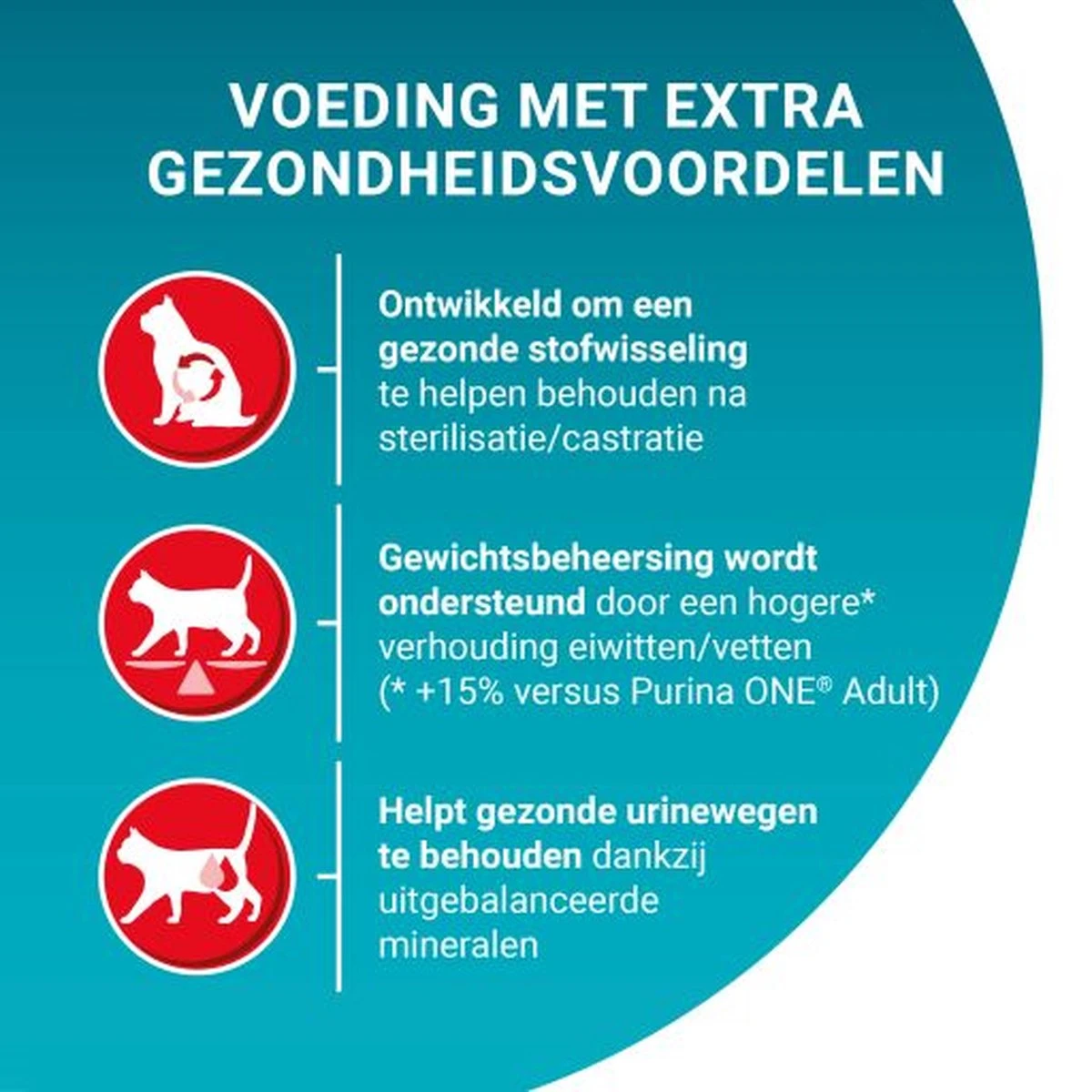 - Gewichtsbeheersing wordt ondersteund door een verhoogde* verhouding eiwitten/vetten wanneer gevoed volgens de voedingsrichtlijnen (*+15% versus Purina ONE Adult)