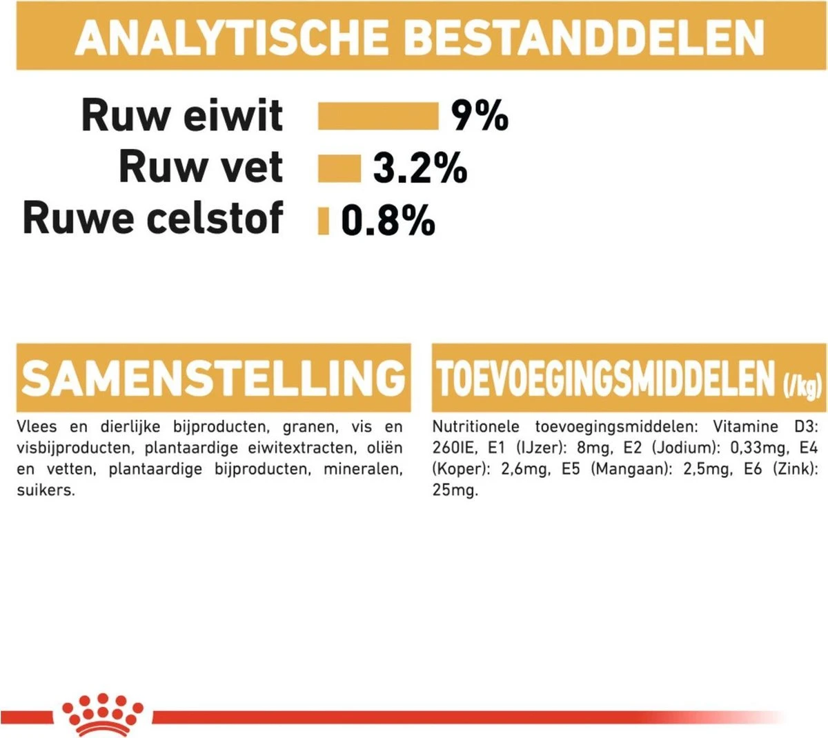| Voedingswaarde | Vlees en dierlijke bijproducten, granen, vis en visbijproducten, plantaardige eiwitextracten, mineralen, plantaardige bijproducten, oliën en vetten, suiker |