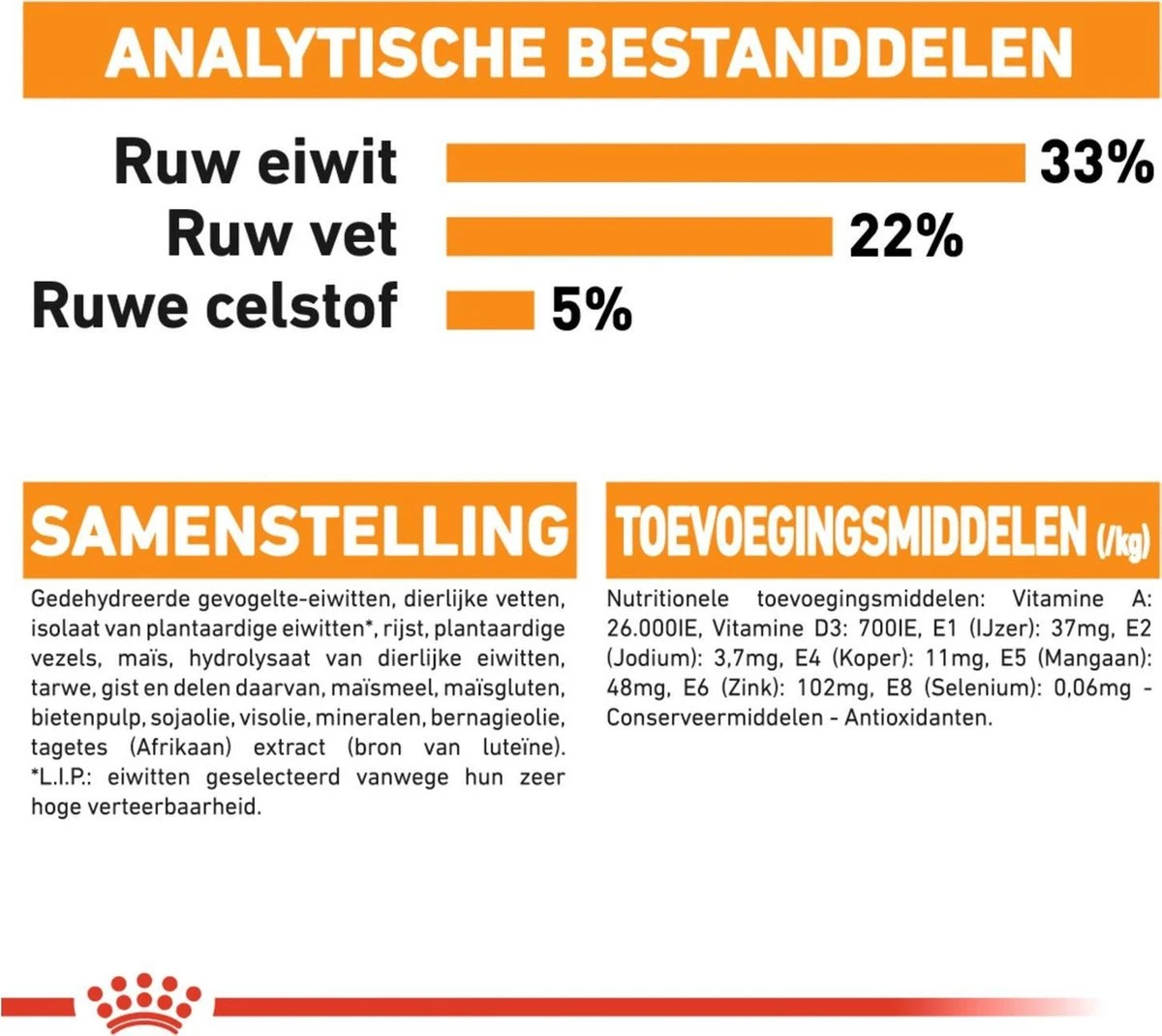 | Voedingswaarde | Samensteling: gedehydreerde gevogelte-eiwitten, rijst, dierlijke vetten, isolaat van plantaardige eiwitten*, maïs, plantaardige vezels, maïsgluten, hydrolysaat van dierlijke eiwitten, gist, bietenpulp, sojaolie, visolie, mineralen, eipoeder, bernagieolie, tagetes (Afrikaan) extract (bron van luteïne) |