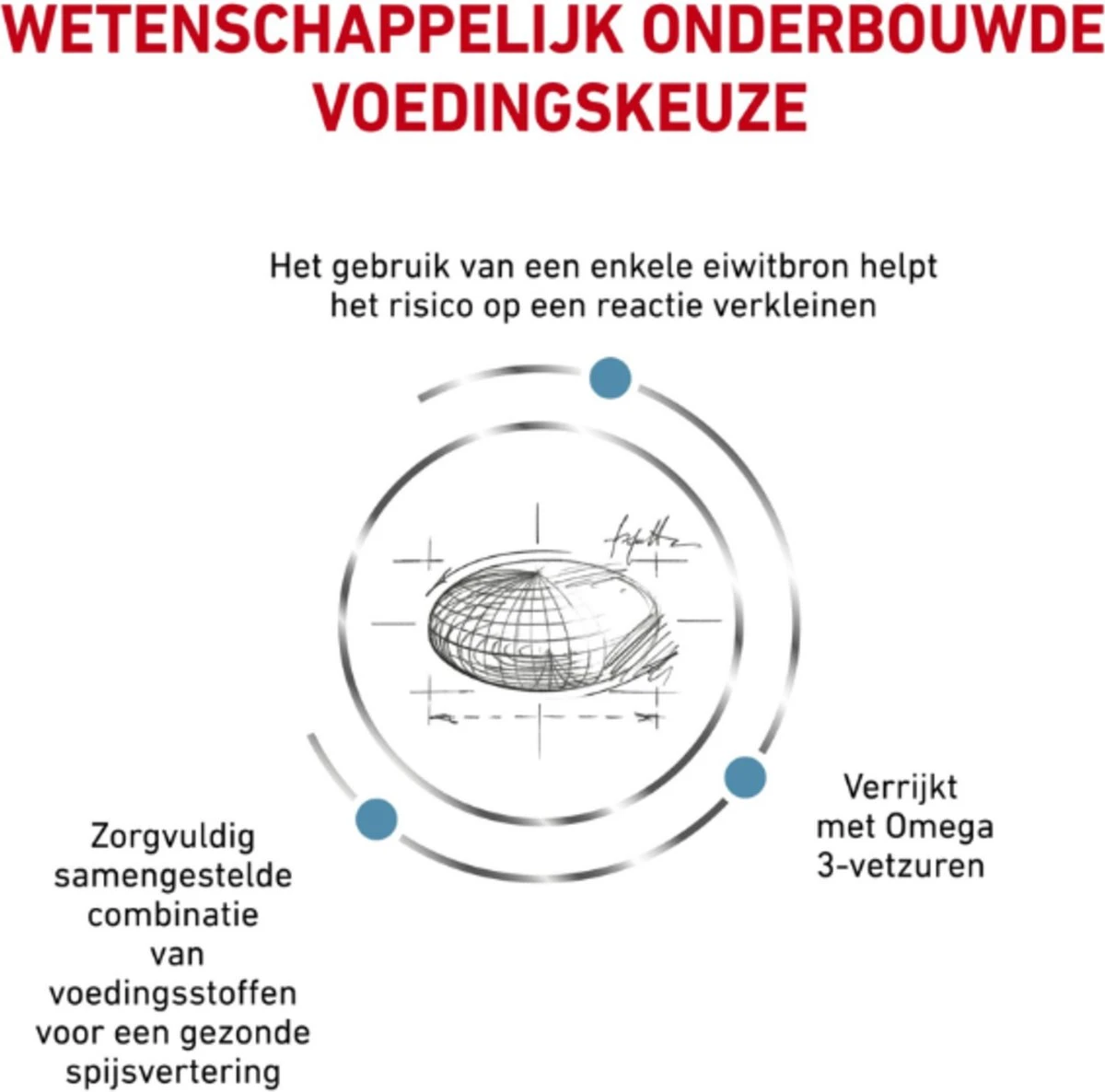 Het Royal Canin Sensitivity Control dieet maak gebruik van een enkele dierlijke eiwitbron waardoor de kans op een allergische reactie of -overgevoeligheid zeer beperkt is. Het is daarnaast ook goed in te zetten bij katten die vaak last hebben van maag- en darmproblemen zoals braken en diarree doordat de voeding zeer licht verteerbaar is. Samenstelling / Ingrediënten Vlees en dierlijke bijproducten (40% kip), Granen (4% rijst), Oliën en vetten, Mineralen, Plantaardige bijproducten, Suikers. Toevoegingsmiddelen (per kg): Nutritionele toevoegingsmiddelen: Vitamine D3 334 IE, E1 (ijzer) 35 mg, E2 (jodium) 0.4 mg, E4 (koper) 3.8 mg, E5 (mangaan) 4 mg, E6 (zink) 38 mg. Technologische toevoegingsmiddelen: Calciumsulfaat 0.16 g. Analytische bestanddelen: Ruw eiwit 7.2 %, Ruw vet 6.5 %, Ruwe as 1.5 %, Ruwe celstof 1 %, Vochtgehalte 80 %, Essentiële vetzuren EPA/DHA 0.24 %.
