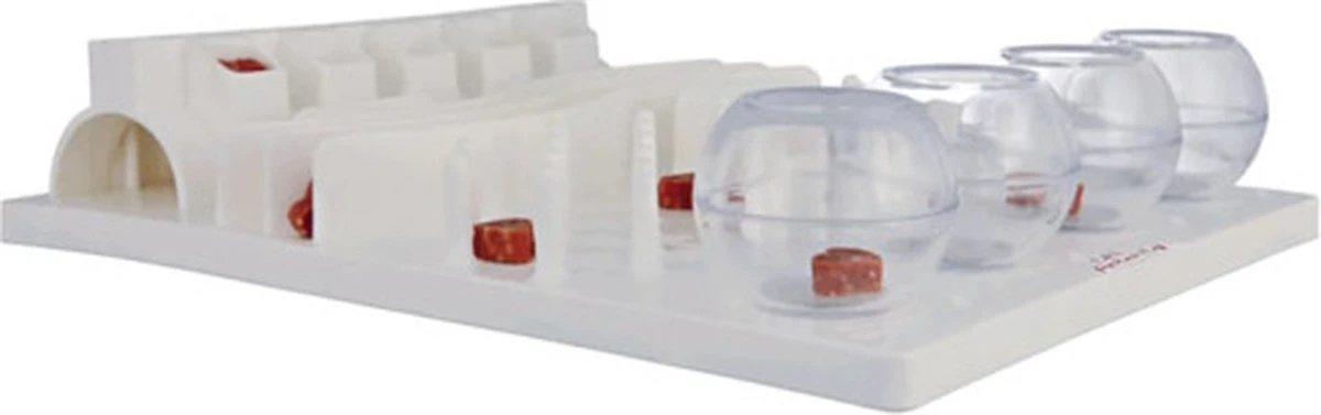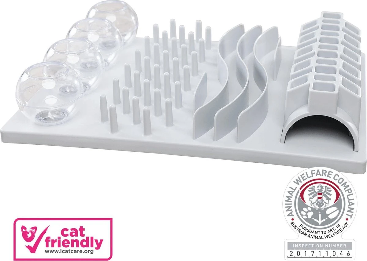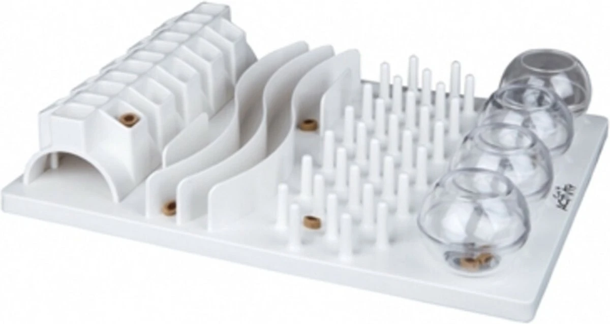 Het uitdagende Trixie Cat Activity Fun Bord bordspel bevat vijf verschillende spellen waarmee je jouw kat kunt uitdagen om op een speelse manier een snack te verdienen. Leg een snack of brokje in de tunnel, in een vakje, een gleuf, tussen de pinnen of in een van de bakjes. De kat zal zijn pootjes en behendigheid moeten gebruiken om de beloning te pakken te krijgen. Dit is ook te doen met gewoon voer, waardoor je kat langer bezig zal zijn met eten en dus minder de kans heeft zijn voer naar binnen te schrokken. Ook ideaal voor oudere of zieke katten.
