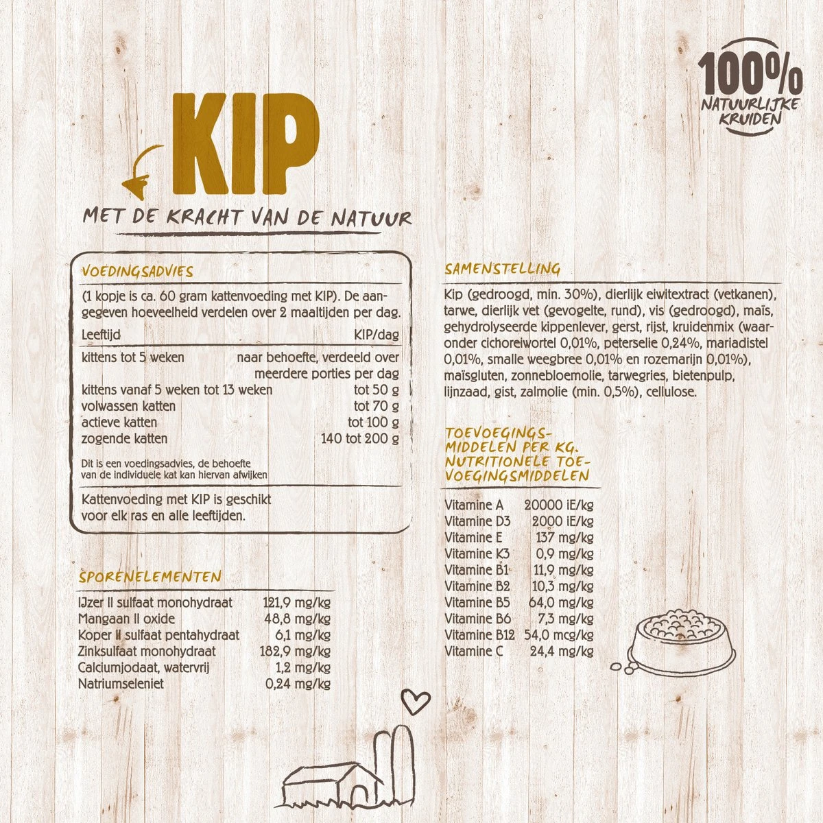 Aan CARE met KIP volledige kattenvoeding is een kruidenreceptuur van meer dan 10 verschillende soorten toegevoegd. Elk kruid geeft zijn eigen, specifieke ondersteuning op het lichaam en de gezondheid. De combinatie van alle soorten samen maakt de werking nog effectiever. De kruidenmix is vanuit veel kennis en ervaring samengesteld.